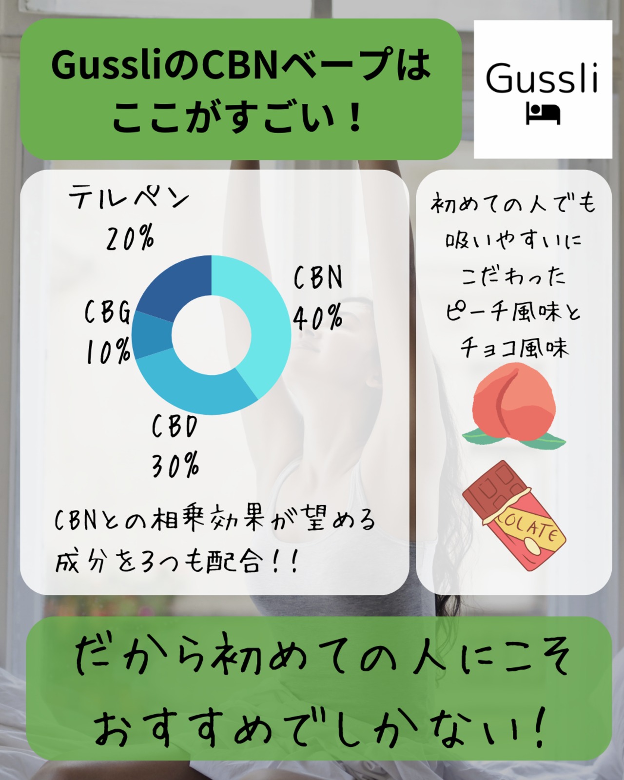 CBN40%,CBD30%,CBG10%,テルペン20%の高濃度配合です。