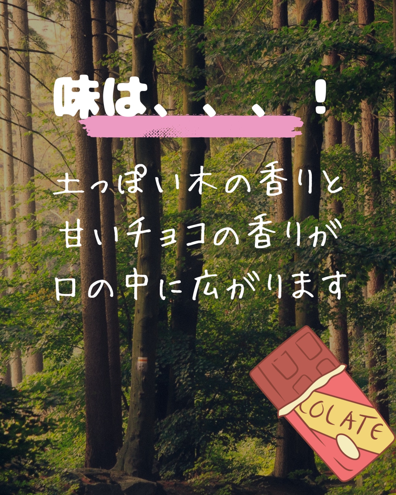 土っぽい木の香りと甘いチョコの香りが口の中に広がり、おやすみ前のリラックスタイムをもっとぜいたくに。